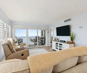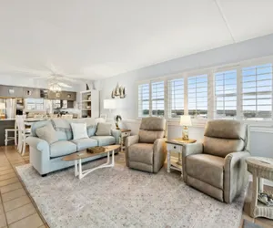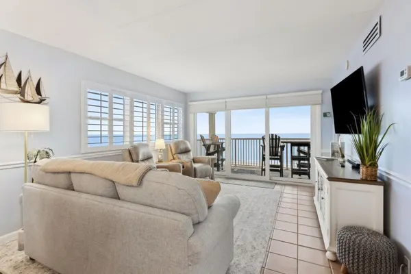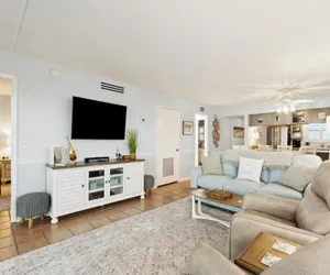 This 6th floor Corner unit is a bright and sunny 2 bedroom, 2 bath treasure with miles-long views of the sand and sea! The northern views of the beach from the balcony are truly incredible! This end unit allows for extra special views and even more sunshine! The stocked kitchen has been newly renovated with beautiful cabinets and granite counters. Both the master bath and the guest bath have also been recently updated, including counter-height cabinets and quartz countertops. The master bedroom has a King Bed and large wall-mounted swivel TV w/cable. The guest bedroom is furnished with one Queen Bed and one Double Bed along with a small flat-screen TV w/cable. Living room has a large wall-mounted swivel TV w/cable, a DVD player, and a queen sleeper sofa. Wi-Fi throughout the unit. There is a full-size washer and dryer in the unit for your convenience. This unit has comfortable furniture and tasteful decor. The balcony is beautifully furnished, and an ideal place to enjoy your morning coffee or afternoon cocktails!