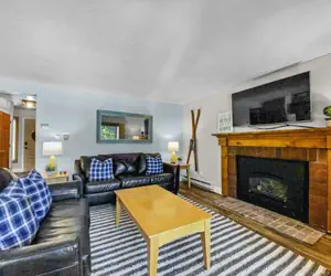 -- Living Room: Gas fireplace, queen sleeper sofa, flat screen TV