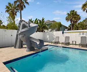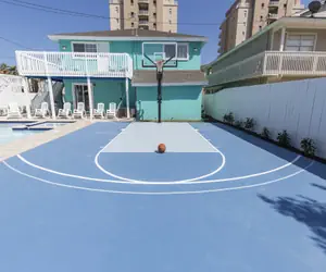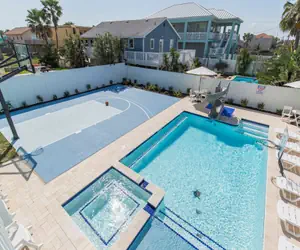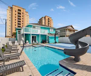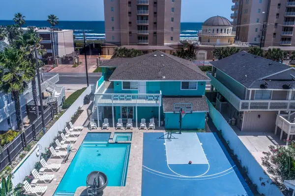 -The newly built heated pool is the largest on South Padre Island, for a single family house. The pool features an 8 person hot tub, submerged tanning area, brand new water slide (2026), basketball hoop and newly installed travertine pool decking. This house has unobstructed sunlight all hours of the day, perfect for sun tanning! Guests will enjoy their time in this tropical backyard.