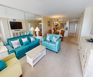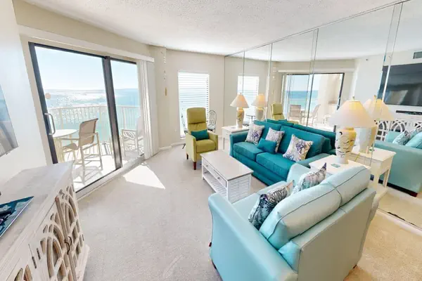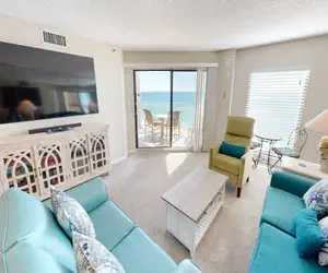 The Living room has three plush chairs, a couch that doubles as a Queen Sofa Sleeper, a big screen HDTV, a Blu-Ray Player, a small table set for two, balcony access, and stunning views of the Gulf of Mexico.