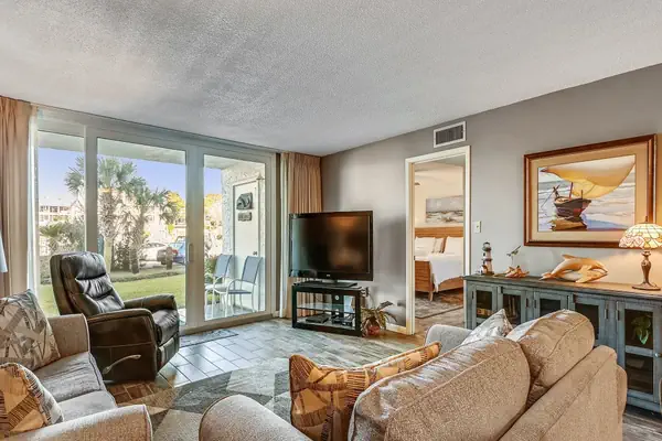 When you enter the condo the large kitchen will catch your eye, with ample counterspace, full size appliances and all cookware is provided. The dining area seats 4 but there is additional seating around the kitchen bar. The Living room offers a view of the Destin Harbor thanks to the floor-to-ceiling sliding glass doors.