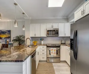 There is a King bed in the master bedroom and enjoy the extra large master bath with walk in shower and spa tub, has a queen bed guest bedroom and a Queen sofa sleeper in the living room to accommodate extra guests.