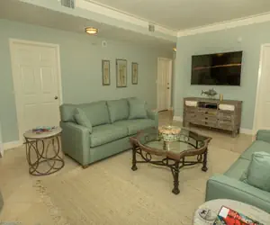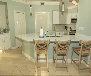 Standing in the entryway of the condo, The Kitchen and Dining Area is on your right, the Living Room is straight ahead, and the bedrooms and bathrooms are to your left. The Kitchen has bar seating for three guests, quartz counter tops, full size top of the line new stainless steel appliances, and all the pots, pans, dishware, and silverware needed to prepare your favorite meal. The Dining Area has a rectangular table set for six guests.