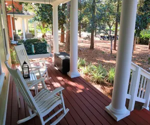 This home is located in a cul-de-sac with a large yard to enjoy. We feature wood floors, granite counter tops, vaulted ceilings, comfortable pillows, linens, towels and fully equipped kitchen and laundry facilities. You will enjoy the cheerful décor and all the little extra touches like the furnished spacious back porch overlooking the lake toward the pool. Try your morning coffee and evening sunsets while relaxing in the rocking chairs on the large white pillared front porch. There is a wrap around sofa with a full sleeper in the living room for additional sleeping convenience and this house comes complete with cable TV in each room as well as WIFI access.