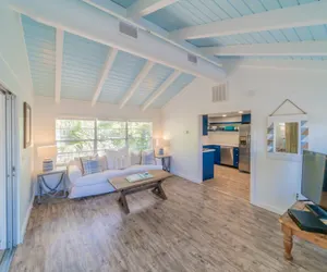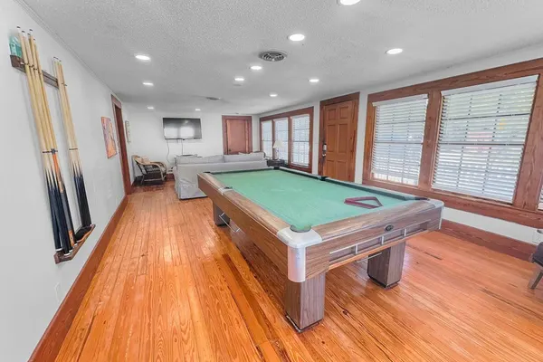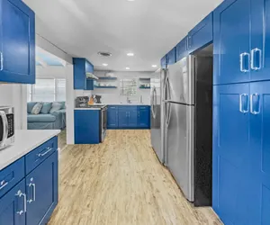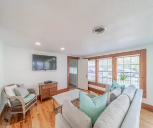 Cole Bin is a single-story residence that offers a private entrance, convenient street parking, a fenced yard suitable for pets, and a spacious deck for outdoor relaxation. Upon arrival, guests are greeted by a generously sized living room equipped with amenities including a pool table, television, sleeper sofa, and ample seating. Positioned to the right of the living space, the first bedroom features a queen bed and a twin bed, with direct access to a nearby hallway bathroom. Progressing through the living room, one will find a sizable dining area and an adjacent laundry room that flows seamlessly into the well-equipped kitchen and sunlit Florida room. Situated to the left of the dining area, a second bedroom is furnished with two queen beds and a twin bed, sharing a conveniently located hallway bathroom. The Florida room leads to a lavish master bedroom with a king-sized bed and a luxurious en suite bathroom.