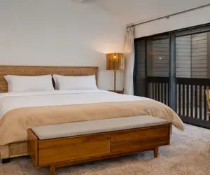 Master Bedroom Ensuite: Your sanctuary boasts a king-sized bed with luxurious Pendleton bed furnishings. Enjoy the convenience of an ensuite bathroom featuring a stand-up shower and a double vanity sink. Plus, there's a flat-screen TV for your entertainment.