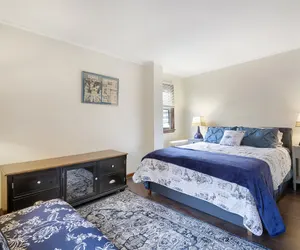 The apartment has two bedrooms, each with new queen beds, and an office space with a desk in the larger one. Parking is not included, but there is a pay parking garage across the street. Pets are allowed by request on a case by case basis and for an extra fee.