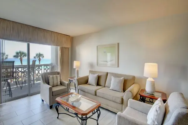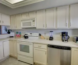 This wonderful Gulf-front view rental has a commanding view of the beautiful Gulf of Mexico and one of the two pools in the complex – one of which is heated in the cooler months. The living room and master bedroom have access to a large private balcony. You will enjoy sitting on the balcony, which is furnished with chairs and a table for your comfort and enjoyment. The floor-to-ceiling patio doors in the living room and master bedroom enhance your view of the Gulf of Mexico. The kitchen, which also has a view of the Gulf, comes equipped with all the comforts of home, including a full-size refrigerator, cook-top stove and oven, microwave, and dishwasher. All the utensils and appliances needed to prepare and serve meals are supplied for your convenience.