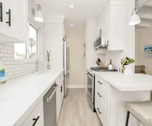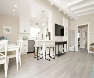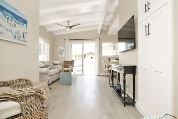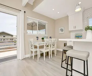 Stepping back in the property there is a quaint dining table just off of the all-white, newly remodeled kitchen. Stacked laundry unit is just off the living room, a convenience not always found in beach homes.