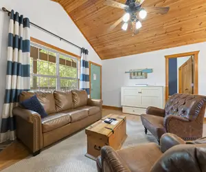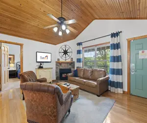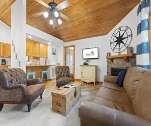 The living area is spacious and comfortable, complete with a plush sofa, armchairs, and a flat-screen television. There is also a gas fireplace to cozy up to in the evenings. The kitchen is fully-equipped with all the necessary appliances and cookware for meal preparation.