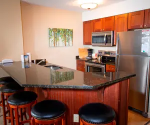 This newly remodeled unit has a Queen bed in the bedroom, a queen sleep sofa in the living room, a full kitchen with breakfast bar and living room with electric fireplace.