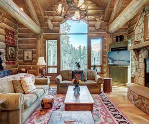 - This 6,000 square-foot log rustic retreat features one-of-a-kind Black Forest, Adirondack and mountain country antique pieces among the many amenities. Amidst the glorious Rocky Mountain views, this unique lodge boasts six bedrooms, six bathrooms, a large open kitchen, living and dining room area and three fireplaces. The lodge is situated on three levels and offers plenty of space and privacy for large groups and families.