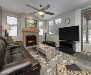 The primary bedroom features a king bed and an attached bathroom with both a stand-up shower and a separate bathtub—perfect for unwinding after a day on the slopes. The second bedroom combines a queen bed with a versatile twin over full futon, while the living room invites relaxation in front of a flat-screen TV.