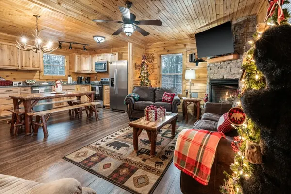 Step inside to a large great room with a gas log fireplace and large flat screen Smart TV with cable service (Login capable to your personal NetFlix, Vudu, Prime, and other Web TV accounts). There is a cushy soft love seat and sofa to relax in while watching your favorite movie, show, or sporting event.