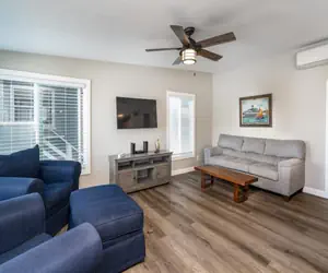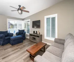The kitchen has plenty of counter space for preparing food and extra storage. The Master bedroom has a queen bed, the second bedroom has a bunk bed with a full and twin bed. Both bedrooms share the full bathroom situated between them. The unit has a shared laundry room with the lower unit guests complete with a washer and dryer. You have have full access to park 2 cars in the garage.