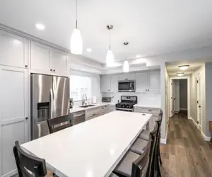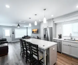 Both front and back units have fully equipped kitchens, dining areas, and large living rooms. Both units also have a master bedroom with a queen bed, a second bedroom with a bunk bed with a full and twin sized bed. The front unit has 2 en-suite bathrooms for each bedroom and the back unit has a shared bathroom between the 2 bedrooms.