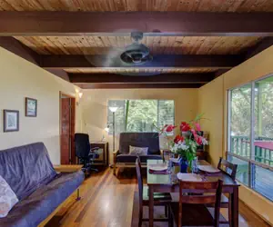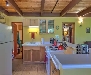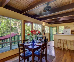 Kehena Treetop Bungalow is a tropical paradise, nestled in among lush green foliage and fruit trees. You’re going to enjoy the beautifully refinished hardwood floors and the tropcial décor.