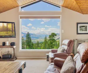 Here, evenings are made for gathering: a crackling wood-burning fireplace, plush recliners, and a home theater system invite laughter, storytelling, or quiet reflection as the mountains stand sentinel beyond the glass.