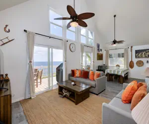 The lower level features two bedrooms and a full bathroom, while the upper level boasts a spacious loft-style third bedroom with a ¾ bathroom. The living and dining areas open through sliding glass doors onto a large lanai, perfect for outdoor dining and grilling.